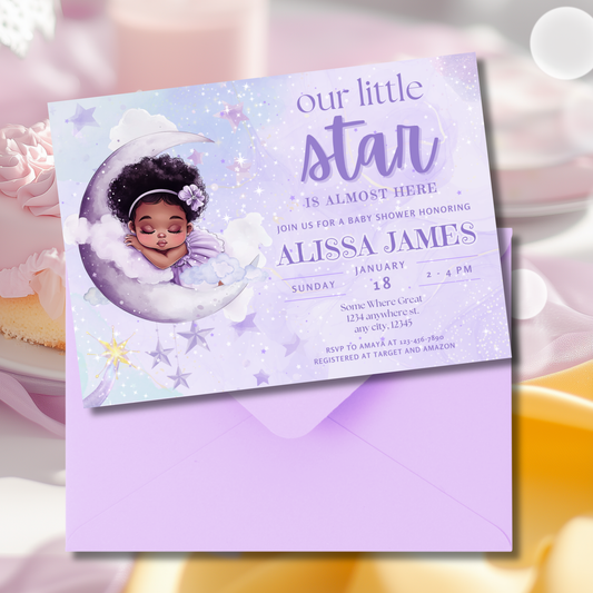 A Little Star Baby Shower For Black Girl Invitation Lavender Canva Template, Edit in Canva, 5x7 - TCPT-013