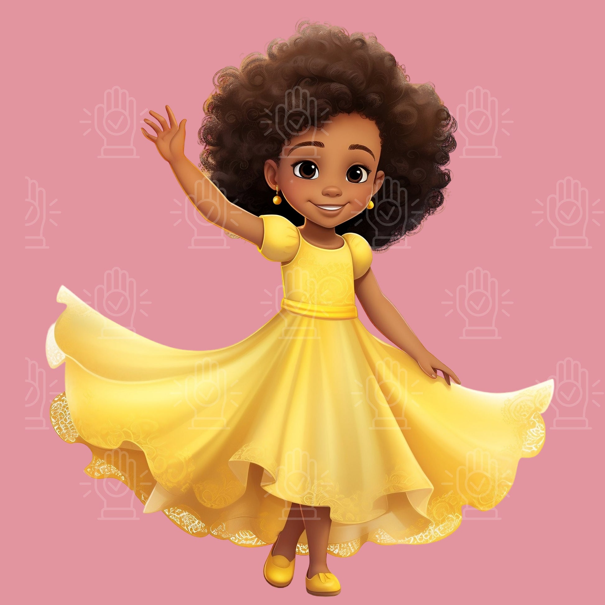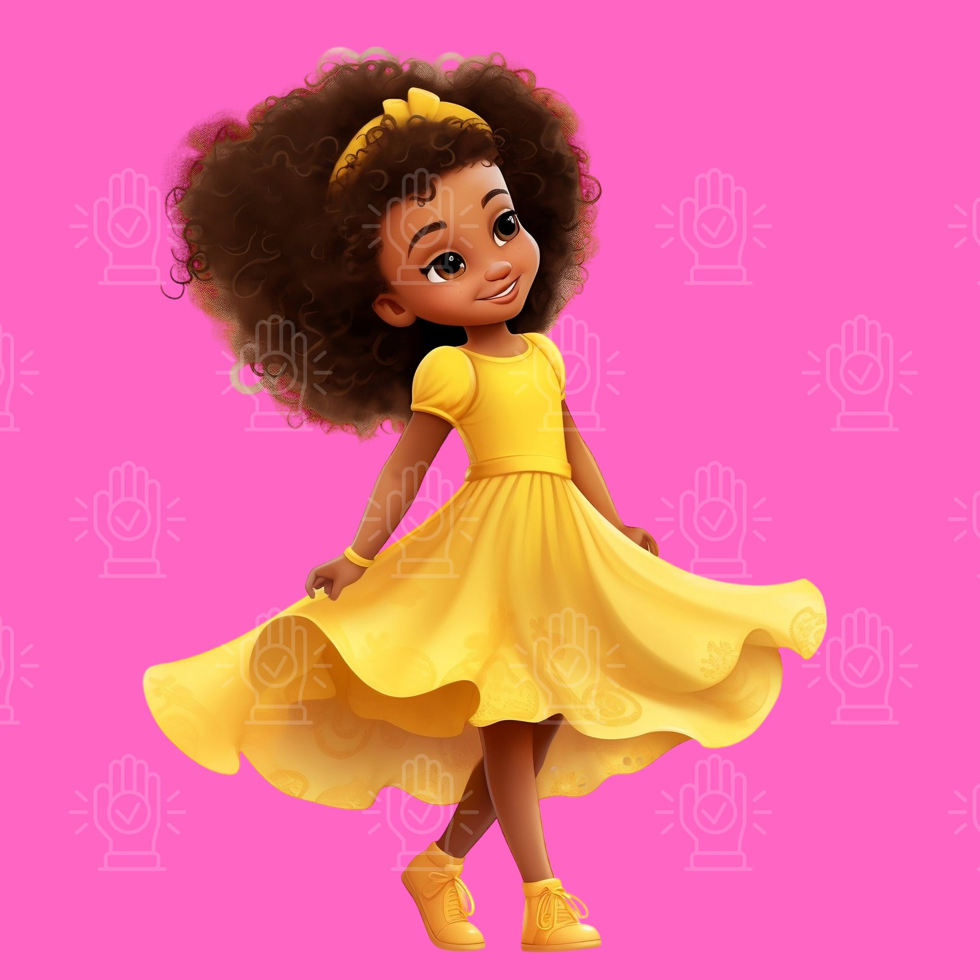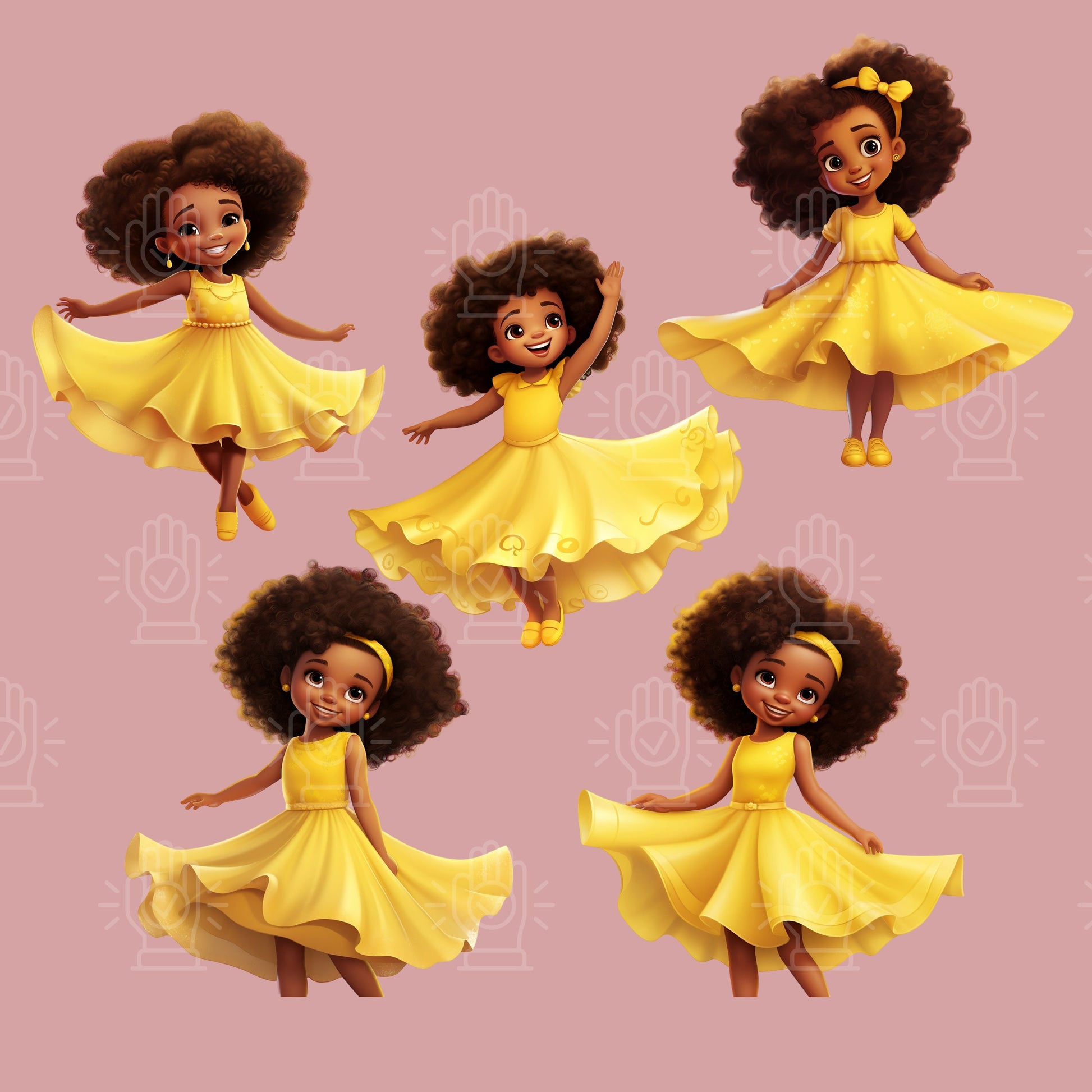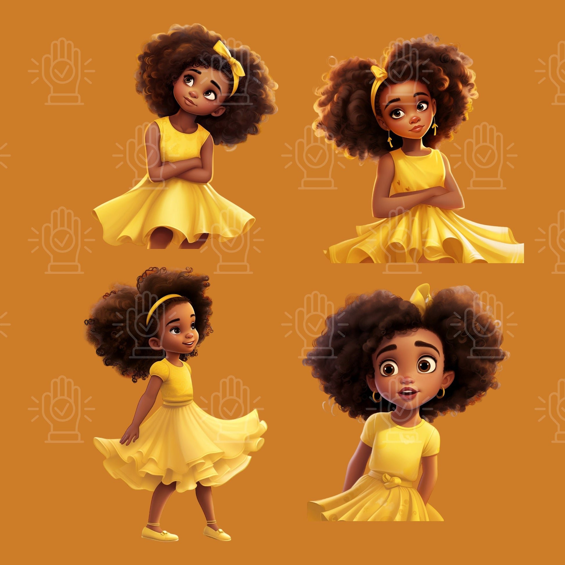 - Each little girl has afro hair and yellow dress. Each design has a slightly different design and face but overall the same consistent character look.