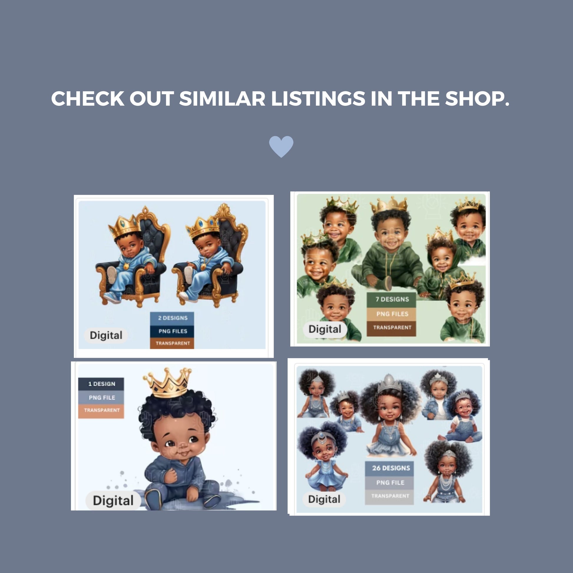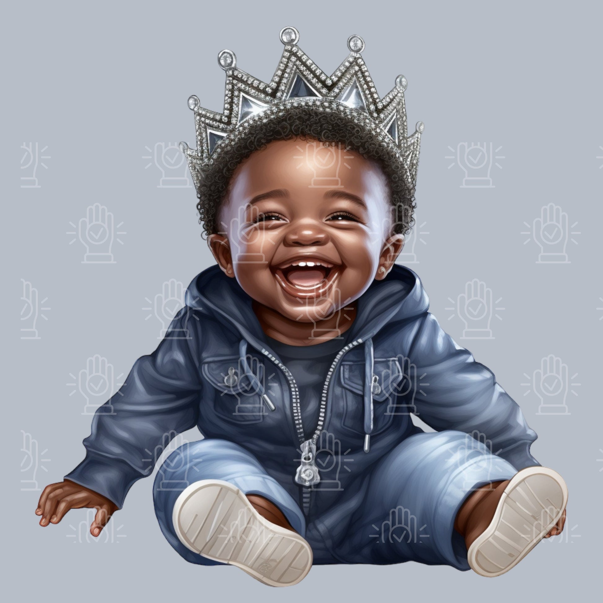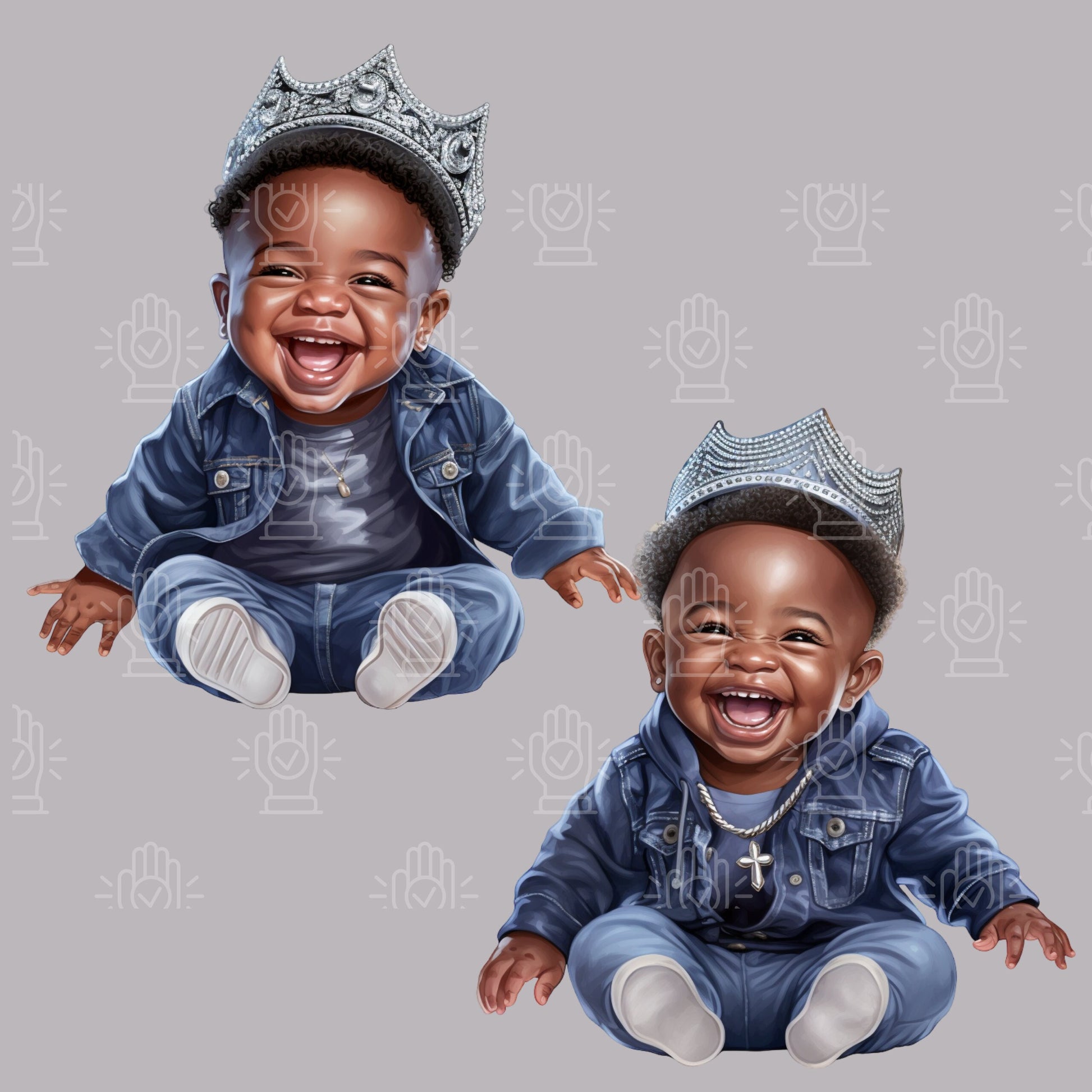 These cute cartoon baby boys are with bling and jean outfits. Some have silver crown on on their afro hairstyle. Diamond jewelry on others.Celebrate the future king, prince, royal little man.
